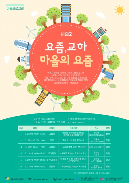 [금요저널] 파주시 교하도서관은 오는 7월 말까지 교하도서관 2층 문화강연실에서 ‘시즌2 요즘, 교하-마을의 요즘’ 프로그램을 운영한다고 밝혔다.