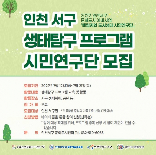 [금요저널] 인천 서구문화재단은 오는 12일부터 21일까지 ‘매립지와 도시생태 시민연구단’ 생태탐구 프로그램 참여자를 모집한다고 11일 밝혔다.