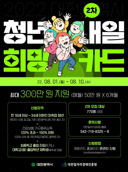 [금요저널] 대전시는 미취업 청년의 구직활동 및 생활안정 지원을 위해 2022년 대전시 ‘청년내일희망카드’사업 참여자를 추가 모집한다고 밝혔다.
