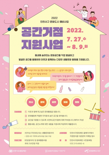 [금요저널] 인천서구문화재단 문화도시센터는 주민 생활문화 활동을 촉진하고 지역 내 생활문화 공간을 활성화하기 위한 사업으로 ‘2022 공간거점 주민문화활동 지원’을 실시하고 오는 9일까지 참여자를 모집한다.