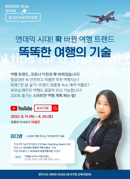 [금요저널] 가장 안전하고 나에게 딱 맞는 여행지는 어디일까? 서울 강서구는 제165회 온라인 강서지식비타민 강좌 ‘똑똑한 여행의 기술’을 개최한다고 밝혔다.