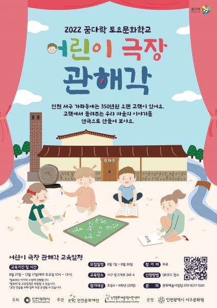 [금요저널] 인천서구문화원이 오는 27일부터 매주 토요일 진행되는 2022 꿈다락 토요문화학교 ‘어린이 극장 관해각’ 프로그램의 참가자를 모집한다고 8일 밝혔다.