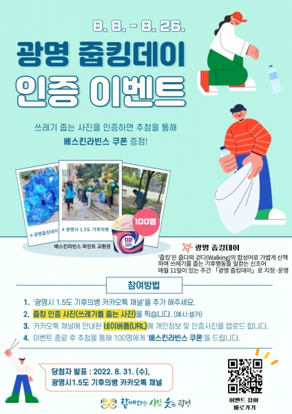 [금요저널] 광명시는 ‘광명 줍킹데이’를 생활화하고자 8월 줍킹데이 참여자 100명을 추첨해 아이스크림 기프티콘을 지급하는 ‘광명 줍킹데이 인증 이벤트’를 8일부터 26일까지 진행한다.