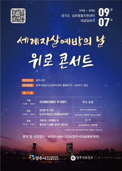 [금요저널] 양주시자살예방센터는 세계자살예방의 날을 맞아 오는 9월 7일 오후 1시 경기종합섬유지원센터에서‘위로 콘서트’를 개최한다.