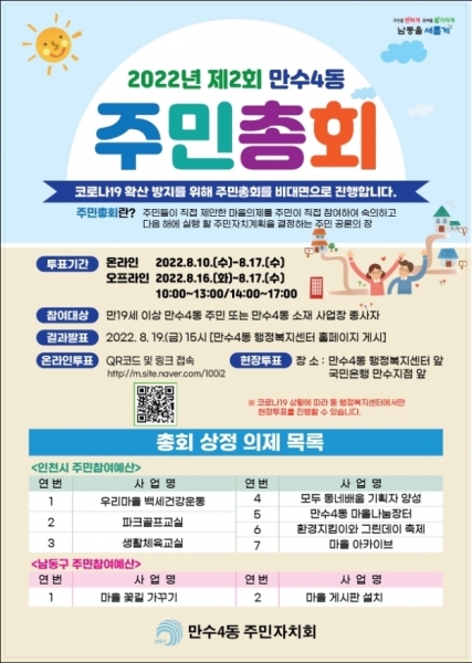 온라인 투표는 8월 10~17일 QR코드 및 링크 접속을 통해 모바일로 참여할 수 있으며 오프라인 투표는 8월 16~17일 만수4동 행정복지센터와 국민은행 만수지점 앞에서 진행한다.