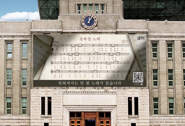 꿈새김판 전면에는 ‘광복절 노래’의 가사를 음미하며 따라 부를 수 있도록 대형 악보를 실었고 하단에는 스마트폰 카메라로 비추면 ‘광복절 노래’를 들을 수 있는 페이지로 연결되는 QR코드를 담았다.