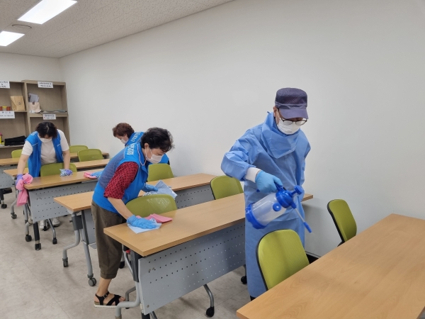 주민자치회 위원들과 동 행정복지센터 직원 등 총 10명은 2명씩 1개 조를 이뤄 강의실 내부뿐만 아니라, 복도, 승강기, 계단 난간 등 수강생들이 이용하는 장소 전체를 소독약품으로 일일이 닦아냈다.
