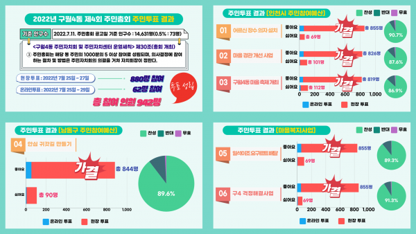 온·오프라인 방식으로 지난 7월 25~29일까지 5일간 진행된 주민투표 결과 투표 정족수인 73명의 13배에 달하는 942명의 주민이 참여한 가운데, 상정된 의제 모두 절반 이상의 찬성표를 얻어 2023년 마을사업으로 선정됐다.