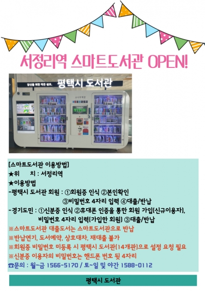 평택시 세 번째로 운영된 서정리역 스마트도서관은 2022년 경기도 도서관 정보화사업으로 선정되어 비대면 서비스 확대 및 독서문화 편의증진을 위해 유동인구가 많은 전철역에 설치하고 서비스를 시작했다.