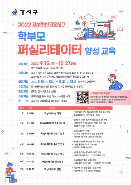 서울 강서구는 ‘2022 강서혁신교육지구 학부모 퍼실리테이터 양성 교육’에 참여할 수강생을 모집한다고 밝혔다.