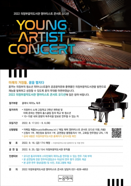 ‘2022 의정부음악도서관 영아티스트 콘서트’는 장래 음악가로 성장하기를 꿈꾸는 청소년들이 의정부음악도서관을 발판으로 성장할 수 있도록 연주 기회를 제공하는 프로젝트의 일환으로 지역 음악 인재 발굴 및 육성을 위해 의정부시 소재 고등학교 3학년에 재학 중인 피아노를 전공하는 학생을 대상으로 연주자 오디션을 실시한다.