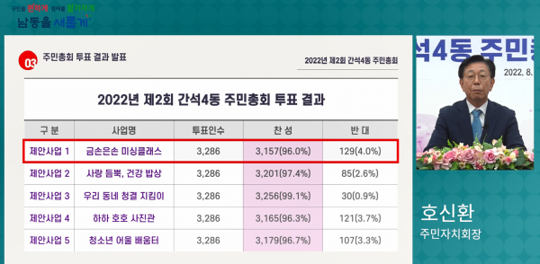 지난 8월 1~10일까지 진행된 투표는 온라인 856명, 오프라인 2,430명으로 총 3,286명의 주민이 참여했다.