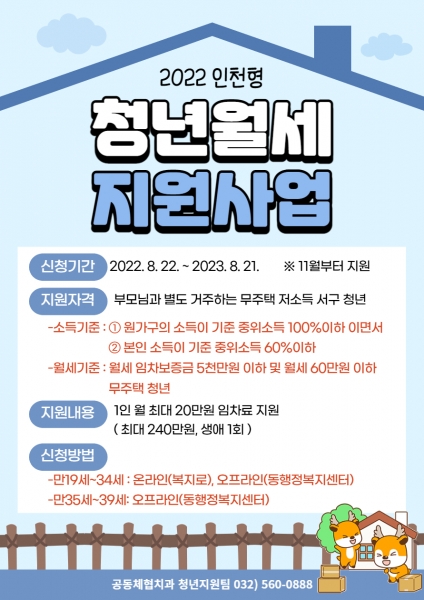 인천형 청년 월세 지원사업에 대한 자세한 사항은 서구청 홈페이지 새소식에서 안내문을 확인할 수 있다.