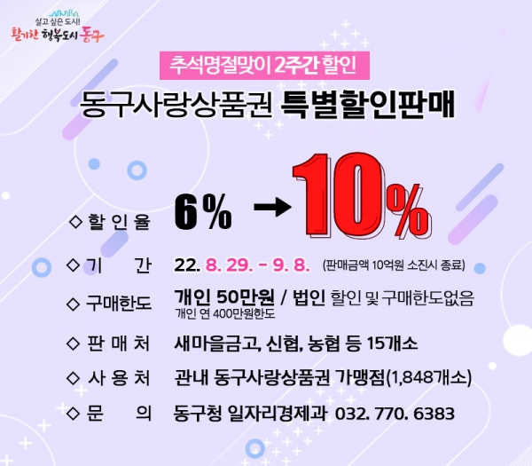 [금요저널] 인천 동구는 추석 명절을 맞이해 오는 29일부터 9월 8일까지 10억원 한도로 동구사랑상품권 10% 특별할인을 실시한다.