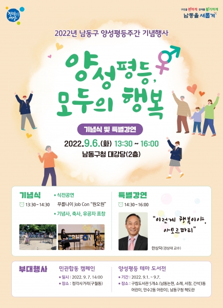 양성평등주간 기념식은 9월 6일 남동구청 대강당에서 오후 1시 30분부터 4시까지 열린다.