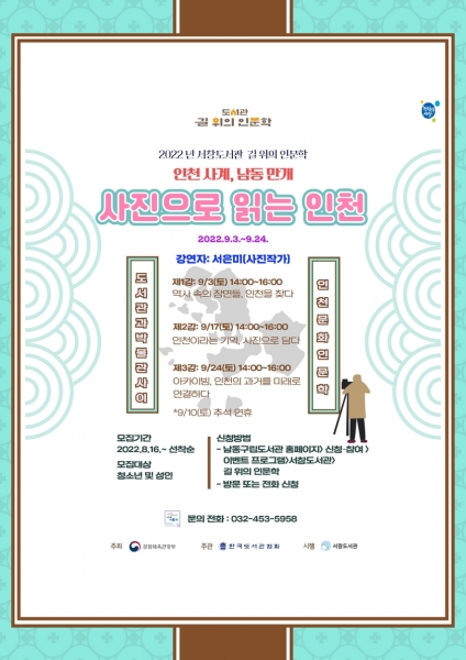 9월에는 인천에서 활동하는 서은미 사진작가가 ‘도서관과 박물관 사이_사진으로 읽는 인천 문화의 힘’을 주제로 강연자로 나선다.