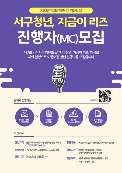 [금요저널] 인천 서구는 오는 24일 개최되는 청년센터 개관식 ‘서구청년, 지금이 리즈’ 행사를 진행할 ‘청년 진행자’를 공개 모집한다고 1일 밝혔다.
