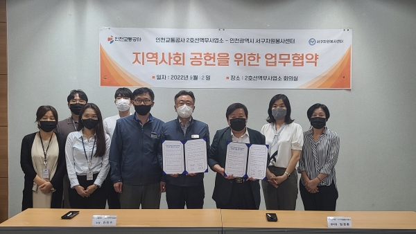 [금요저널] 인천 서구 자원봉사센터가 지난 2일 인천교통공사 2호선 역무사업소와 ‘친환경 실천 동참을 위한 업무협약’을 체결했다고 밝혔다.