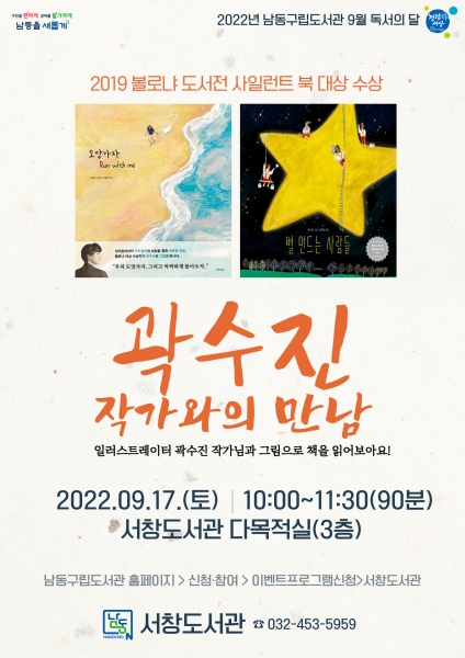 [금요저널] 인천시 남동구 서창도서관은 9월 독서의 달을 맞아 오는 17일 오전 10시부터 도서관 3층 다목적실에서 ‘곽수진 작가와의 만남’을 개최한다고 6일 밝혔다.