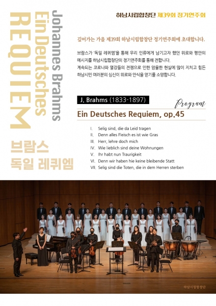 가을을 맞이해 개최하는 이번 연주회는 독일의 작곡가이자 피아니스트인 요하네스 브람스의 ‘독일 레퀴엠’이라는 7악장으로 구성된 레퀴엠 연주를 주제로 하남시립합창단이 수준 높은 정통 클래식 공연을 선보인다.