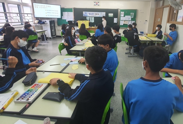 [금요저널] 의정부시 마을·사회적경제지원센터는 8월 22일부터 오는 9월 19일 2022년 사회적경제 청소년 아카데미-청사진을 호원중학교 학생 30여명이 참여한 가운데 4차시 대면 수업을 진행했다.
