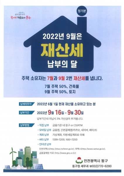 이번 재산세 부과 대상은 2022년 6월 1일 기준으로 동구에 소재한 주택, 토지를 소유한 자로 주택은 연세액을 7월과 9월에 50%씩 나누어 고지되고 주택 부속 토지 외 관내 소유 토지는 9월에 전액 고지된다.