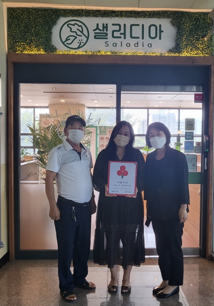[금요저널] 인천 중구 운서동지역사회보장협의체는 지난 23일 운서동 소재‘샐러디아’를 찾아 사랑의 열매 착한가게 현판을 전달했다.