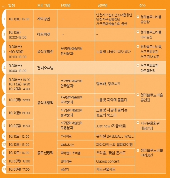 또한 서구문화예술인회 공연협회는 연극 공연 ‘행복해, 장유씨?’를 시작으로 국악 공연 ‘노을빛 국악에 물들다’ 농악 공연 ‘노을빛 서곶에 울리는 풍요의 북소리’가 청라블루노바홀에서 선보인다.