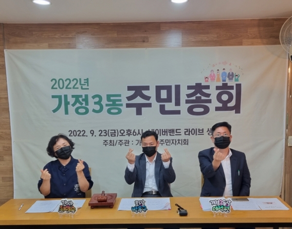가정3동 주민자치회 온라인 커뮤니티를 통해 생중계로 진행된 이번 주민총회는 박용구 주민자치회장의 개회선언을 시작으로 2022년 실행사업 추진 보고 2023년 자치계획 공유 및 마을사업에 대한 선호도 투표, 최종 주민투표 결과발표순으로 이뤄졌다.