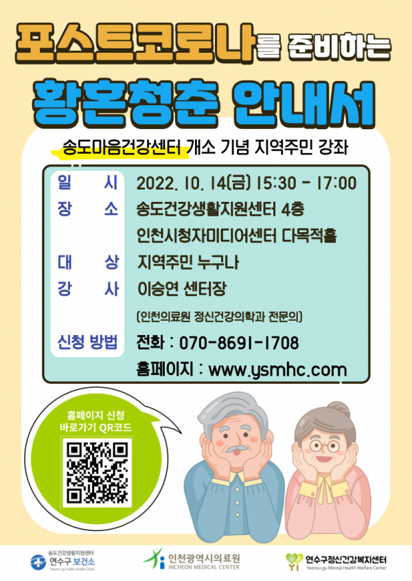 이번 정신건강강좌는 코로나19의 영향을 많이 받는 노년기 지역주민과 보호자 등을 대상으로 ‘포스트코로나를 준비하는 황혼 청춘 안내서’란 주제로 연수구정신건강복지센터 센터장이자 인천의료원 정신건강의학과 전문의인 이승연 센터장이 강연자로 나선다.
