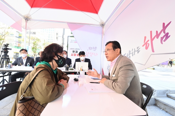 [금요저널] 이현재 하남시장이 12일 시민과 현장에서 소통하는 ‘이동시장실’을 미사역에서 첫 운영해 민생행보를 이어가고 있다.