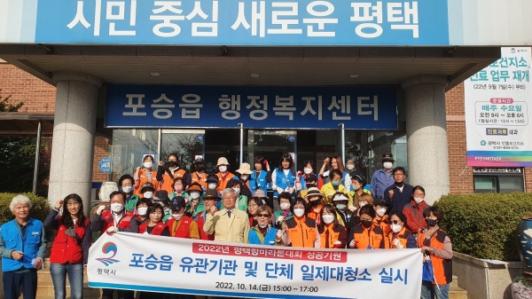 [금요저널] 평택시 포승읍 행정복지센터와 관내 유관기관 및 단체는 지난 14일 평택항 마라톤 대회 개최를 맞아 선수단과 관광객들이 쾌적한 환경에서 편히 머물다 갈 수 있도록 일제대청소를 실시했다.