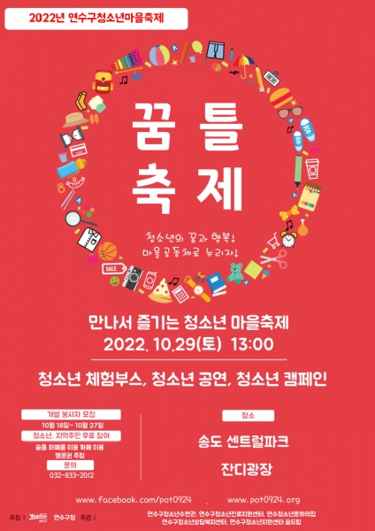 꿈틀 축제에 대한 자세한 사항은 연수구청소년수련관 홈페이지에서 확인 할 수 있으며 자원봉사자 신청은 e-청소년 https://www.youth.go.kr/youth/ 통해 10월 27일까지 할 수 있다.
