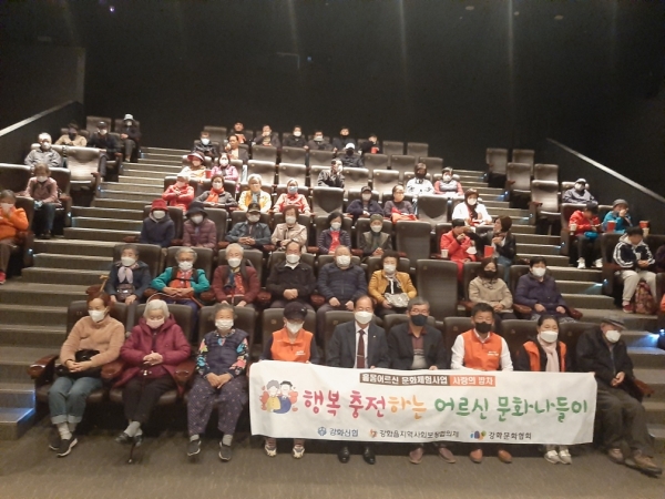 [금요저널] 강화읍지역사회보장협의체와 강화신용협동조합는 지난 1일 강화군 작은영화관에서 저소득 독거노인, 장애인, 어려운 이웃 90여 가정을 대상으로 ‘행복충전하는 문화나들이’ 행사를 가졌다.