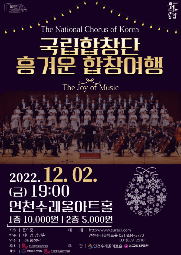 [금요저널] 연천수레울아트홀은 오는 12월 2일 대공연장에서 문예회관과 함께하는 방방곡곡 문화공감사업을 통해 세계최고의 전문합창단인 국립합창단을 초청, ‘흥겨운 합창여행’ 공연을 개최한다.