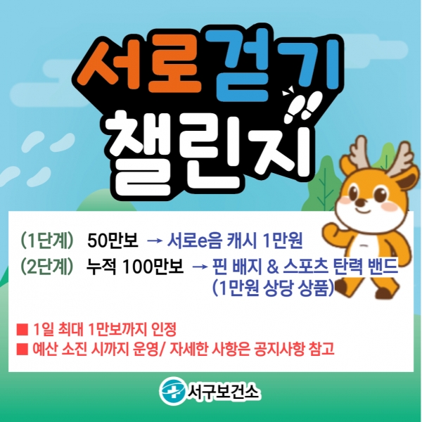 이번 하반기에 실시된 서로걷기 챌린지는 50만 보 달성 시 서로e음 캐시 1만원을, 누적 100만 보 달성 시 우수자 핀 배지와 스포츠 탄력밴드를 제공한다.