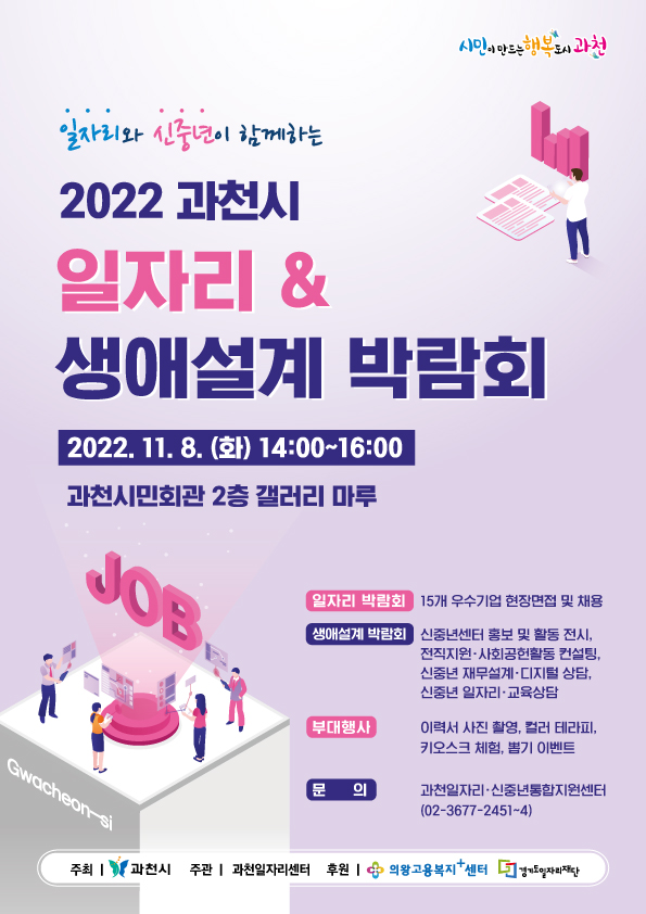 [금요저널] 시는 침체된 채용시장에 활기를 불어넣고 구인·구직난 극복을 위해 오는 8일 시민회관 2층 갤러리마루에서 오후 2시부터 ‘2022 과천시 일자리·생애설계 박람회’를 개최한다.