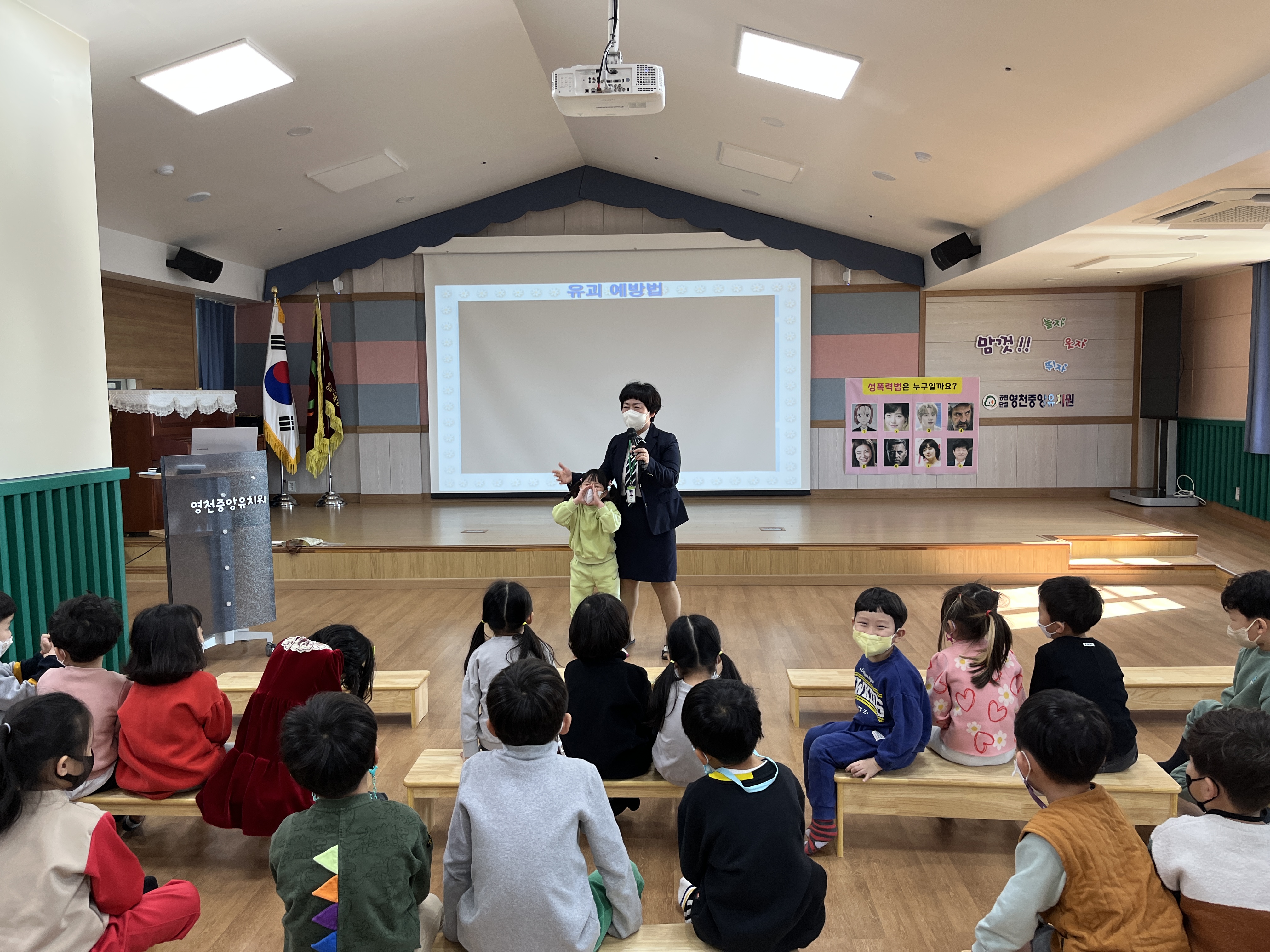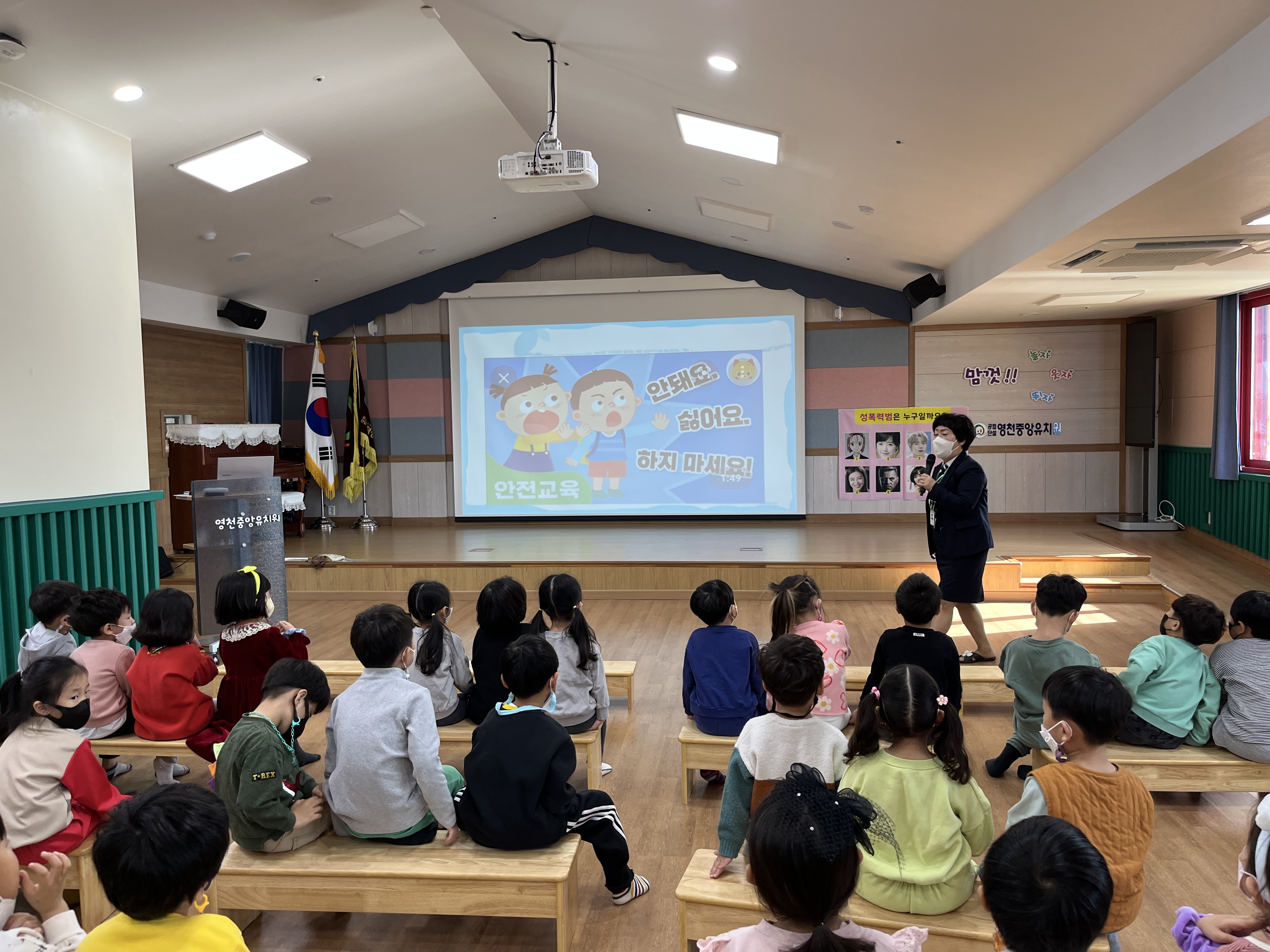 영천중앙유치원(원장 반영란)은 2022년 11월 18일(금) 성폭력 및 유괴 예방 교육을 하였다. 강당에서 연령별로 모여 어린이 안전학교에서 실시하는 강의를 들었다. 나쁜 느낌이 들 수 있는 상황과 유괴 상황에 대해 이야기 나누고 어떻게 대처하여야 하는지 알아보는 시간을 가졌다.