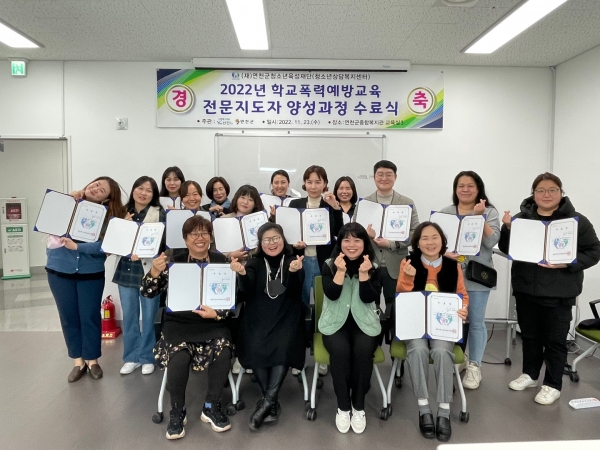 [금요저널] 연천군청소년육성재단 청소년상담복지센터는 지난 23일 연천군종합복지관에서 학교폭력예방교육 전문지도자 양성과정 수료식을 열었다고 24일 밝혔다.