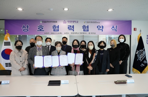 [금요저널] 남양주시 진접읍 주민자치위원회, 대경대학교, 북부장애인복지관은 지난 22일 대경대학교 한류캠퍼스 1층 회의실에서 상호 긴밀한 협력 체제로 관·학 간의 공동 발전을 도모하기 위한 업무 협약을 체결했다.