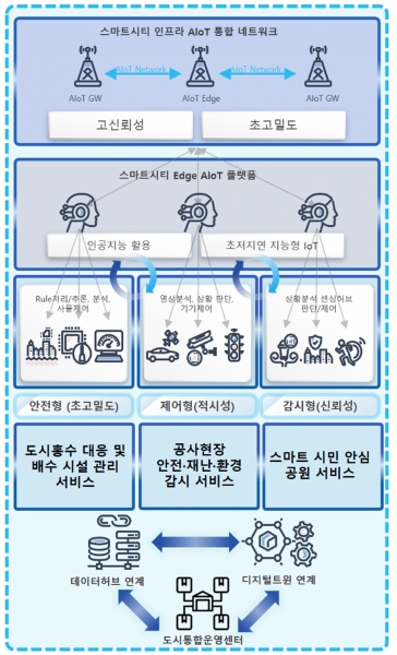 이 기술로 시는 1㎢ 범위에서 하루 100만건 이상의 데이터를 처리하는 초대규모 AIoT 네트워크를 구축해 탄천 유역의 도시홍수 대응 및 배수시설 관리 도심지 공사 현장 안전·재난·환경 감시 스마트 시민 안심 공원 조성 등 3종 실증 서비스를 추진한다.