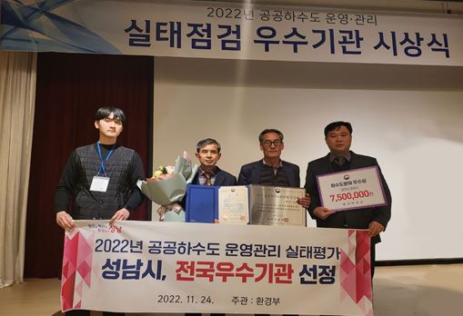 [금요저널] 성남시는 환경부가 4개 그룹으로 나누어 시행한 ‘2022년 공공 하수도 운영·관리 실태평가’에서 Ⅰ그룹에서 2년 연속 우수기관으로 선정돼 인증패와 750만원의 포상금을 받았다고 25일 밝혔다.