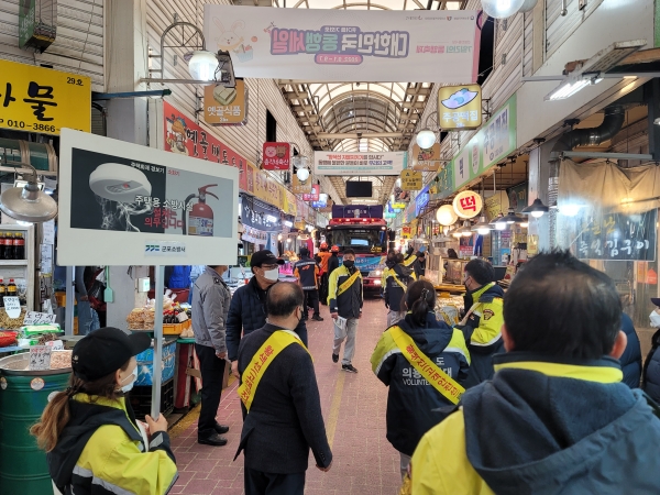 [금요저널] 군포시와 산본시장상인회는 29일 화재에 취약한 군포시 산본동 소재 전통시장인 산본시장에서 화재안전관리 강화를 위한 적치물경계선 준수를 위한 캠페인을 실시했다.