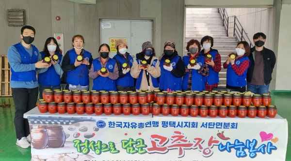 [금요저널] 자유총연맹 평택시지부 서탄면분회는 지난 29일 서탄면사무소에서 회원 및 자원봉사자 등 20여명이 참석한 가운데 ‘이웃사랑 고추장 담그기’ 행사를 개최했다.