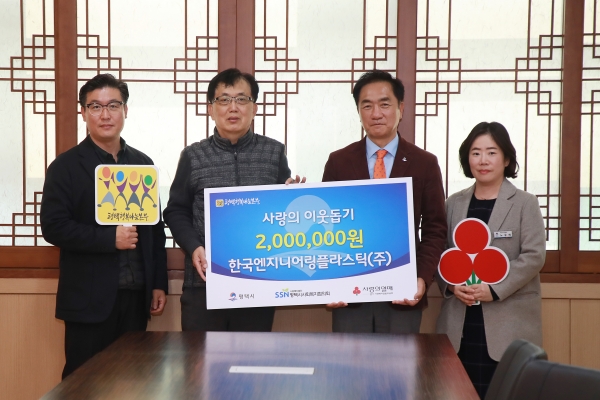 [금요저널] 한국엔지니어링플라스틱은 지난달 24일 평택시청 2층 대외협력실에서 평택행복나눔본부로 사랑의 이웃돕기 성금 200만원을 전달했다.