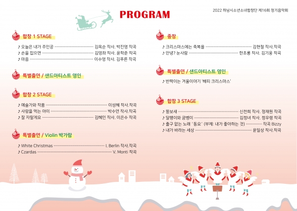 이번 음악회는 아이들이 즐겨 부르는 창작동요와 키즈팝, 캐롤을 들려줄 예정이며 바이올리니스트 박가람의 연주와 샌드아티스트 영인의 특별공연 또한 준비되어 있다.