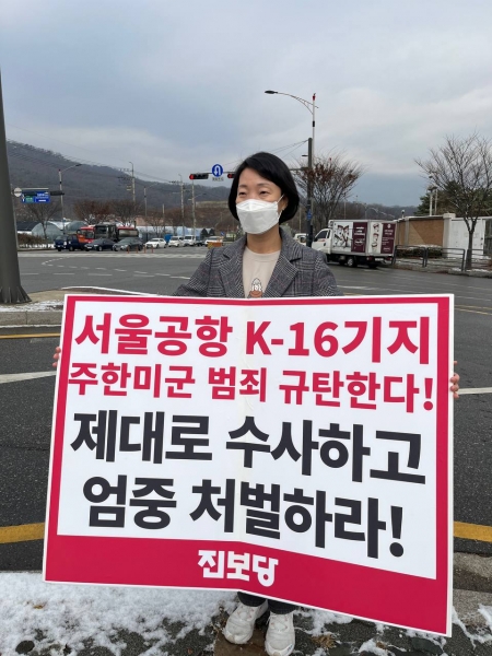 이어 성남 진보당은 “성남 비행장 주한미군 책임자는 즉시 사과하고 미군 병사가 신속하게 수사 받을 수 있도록 책임을 다해야 할 것”이며 “주한미군 범죄를 근절하는 것, 불평등한 한미관계를 청산하는 것은 이제 더는 미룰 수 없는 과제이고 그 피해가 고스란히 시민의 몫으로 돌아가 참을 수 없는 고통을 안겨주고 있는 현실에 침묵하지 않을 것이라며 수사와 처벌이 지연되면 성남시민의 비판 여론과 분노는 커질 것”이라고 주장했다.