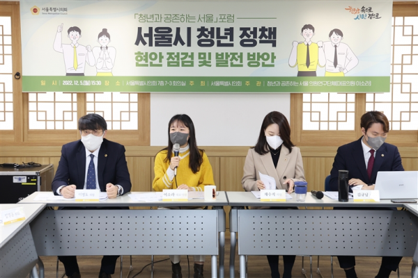 [금요저널] 서울특별시의회 의원연구단체 ‘청년과 공존하는 서울’은 지난 5일 시의회 7-3 회의실에서 ‘서울시 청년정책 현안 점검 및 발전 방안’ 포럼을 개최했다.