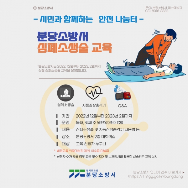 상설 심폐소생술 교육장 운영기간은 오는 12월 12일부터 내년 2월 28일까지이며 접수는 분당소방서 홈페이지를 통해 선착순 모집으로 진행된다.