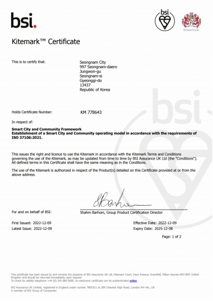 성남시, 영국표준협회 스마트도시 국제 인증받아